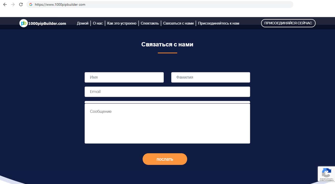 Компания на главной странице представила форму связи, заполнив которую пользователь может написать сообщение аферистам 1000PipBuilder Com. Жулики даже не удосужились эту информацию вывести на отдельную вкладку, или раздел, всё налепили на главную страницу своего сайта.