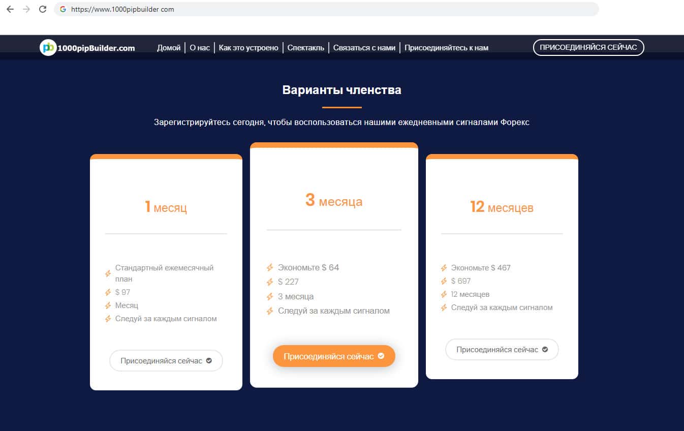 И наконец то компания разводил 1000PipBuilder Com представила свои варианты членства в компании. Контора предложила 3 вида подписки. Первый стоит 97 долларов, подписка оформляется на 1 месяц, второй вид подписки это на 3 месяца, стоимость которой составляет 227 долларов, и подписка на год составляет 697 долларов.