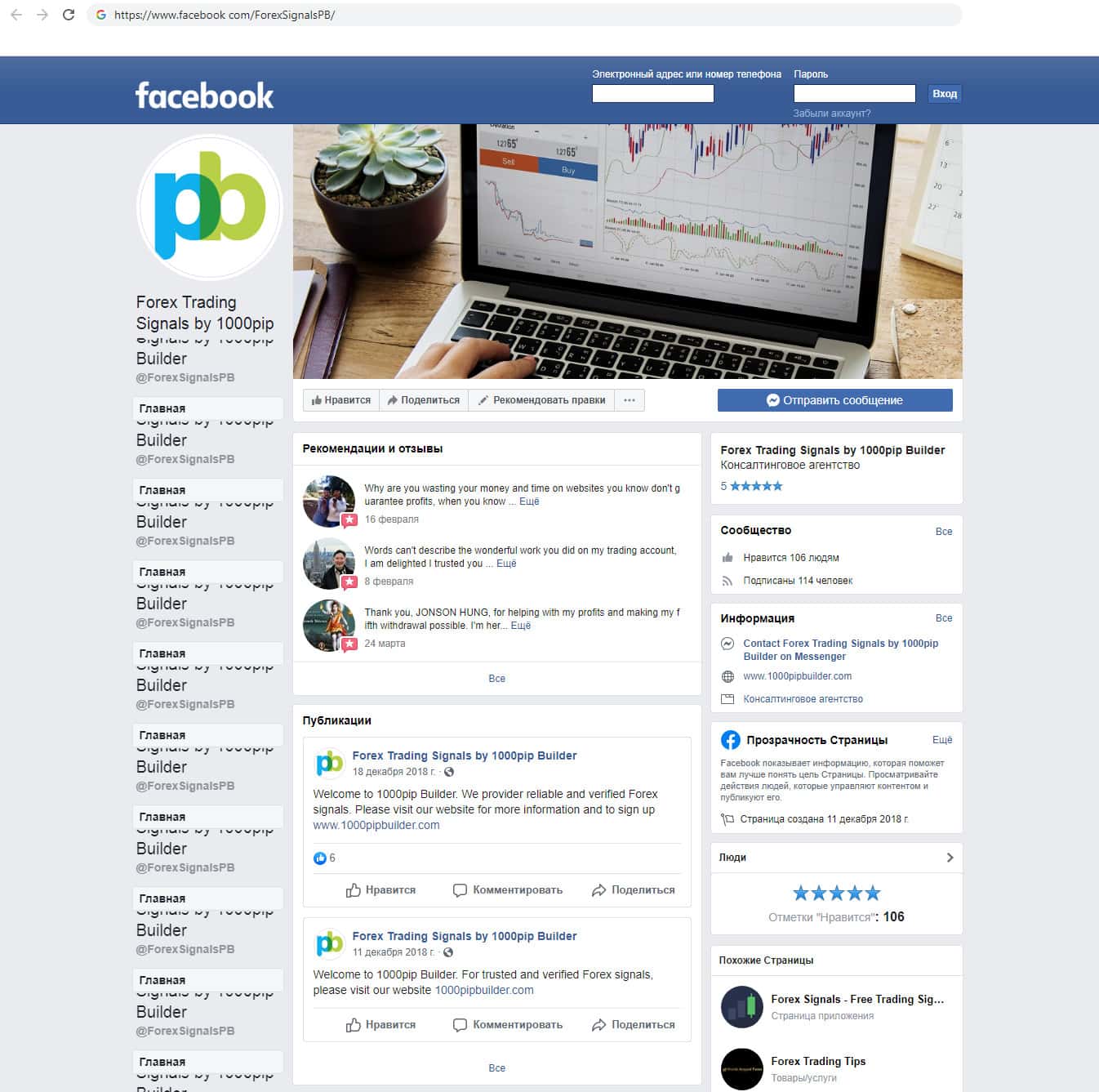 У разводил 1000PipBuilder Com есть страница на самой популярной в мире социальной сети - фейсбуке. Но компания не пользуется там большой популярностью, набралось всего 114 подписчиков, что крайне мало для компании такого масштаба, которая указывает, что работает с множеством стран, и имеет кучу клиентов.