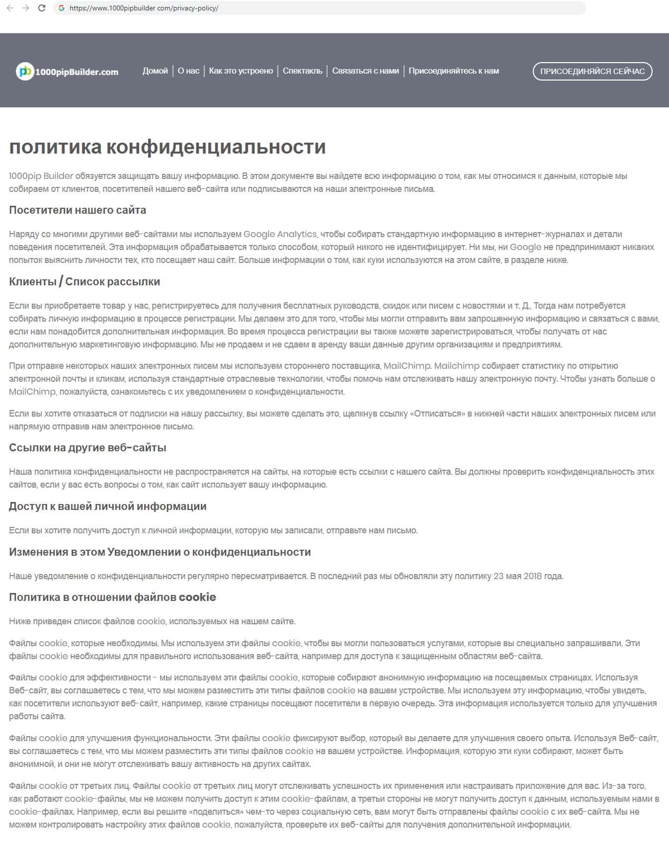 - Политика конфиденциальности компании жуликов 1000PipBuilder Com
