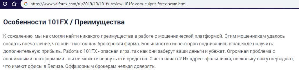 Далее в статье говорится о том, что все перечисленные аферистами 101 ФХ преимущества являются исключительно лапшой на уши наивным пользователям и расположены исключительно с целью обмана и развода на деньги. На изображении, расположенном ниже, вы можете наглядно увидеть мнение веб-сайта валфорекс ком о деятельности мошенников 101FX.