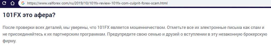 В связи с мошеннической и противозаконной деятельностью аферистов 101FX на просторах сети интернет веб-сайт валфорекс ком посвятил данной конторе статью, началом которой является информация о том, что мошенники 101 ФХ попросту обманывают людей. На изображении, расположенном ниже, вы можете наглядно увидеть начало статьи об аферистах.