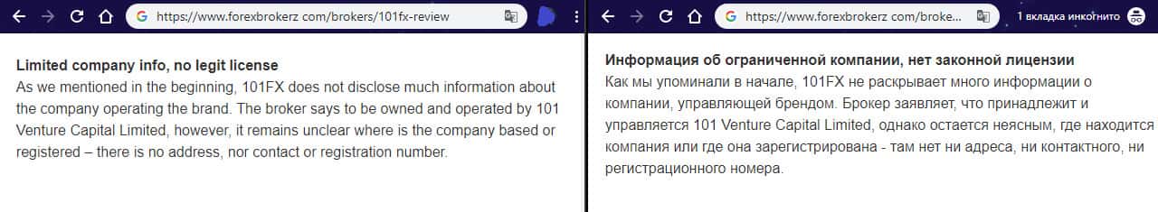 Ввиду наглой мошеннической деятельности, направленной на развод наивных пользователей сети интернет аферистами 101 ФХ веб-портал форексброкерз ком посвятил данным мошенникам отдельную статью, которую начал с отсутствия лицензии у жулья 101FX, а так же общей ограниченности конторы аферистов 101 ФХ, которая скрывает свои реальные данные.