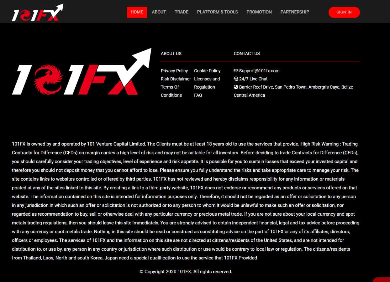 Завершается же сайт у проходимцев 101FX довольно стандартно и ожидаемо, а именно ссылками на различные разделы подвального сайта аферистов 101 ФХ и предупреждением об отказе от ответственности мошенниками 101FX за потери наивных пользователей сети интернет. На изображении, расположенном ниже, вы можете наглядно увидеть окончание сайта жулья.