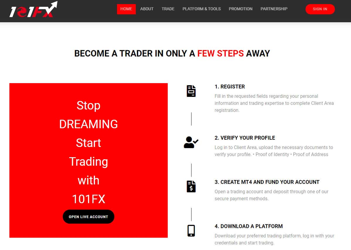 После на подвальном сайте у лохотрона 101 ФХ размещена последовательность действий, которая объясняет наивным пользователям сети интернет как именно нужно начинать процесс слива своих денег в мошенническую контору аферистов 101FX под предлогом торговли форекс. На изображении, расположенном ниже, вы можете наглядно увидеть очередной раздел сайта.