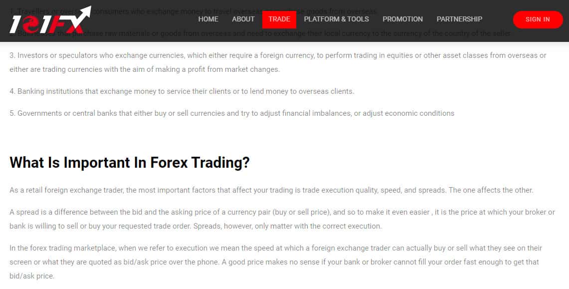 В попытках привлечь новичков в свою помойку жулики 101FX добавили на свой сайт раздел, в котором разместили якобы необходимые ответы на вопросы и объяснение принципов торговли форекс. Однако данные материалы крайне поверхностны и не несут никакой информационной нагрузки, из чего можно легко сделать вывод, что они были добавлены для виду.