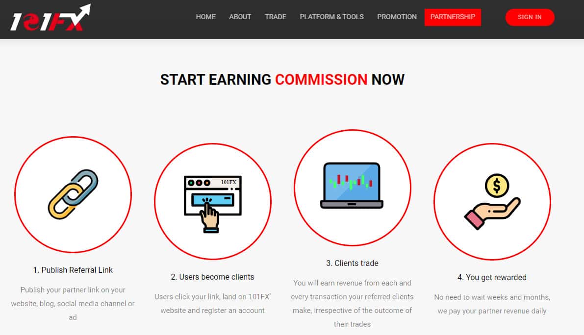 Еще одним довольно стандартным маневром в исполнении аферистов 101 ФХ является их партнерская программа, в которой жулики 101FX предлагают привлекать в их шаражкину контору новых пользователей для дальнейшего слива их средств. За это лохотрон 101 ФХ предлагает определенный процент. Ниже вы можете увидеть данный раздел партнерской программы.
