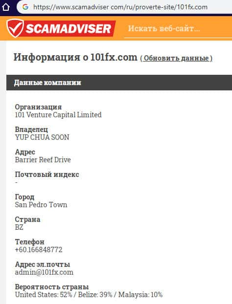 В связи с мошеннической и противозаконной деятельностью лохотрона 101 ФХ его реальные руководители предпочитают анонимность дабы избежать ответственности со стороны правоохранительных органов. Техническую же информацию о сайте жулья 101FX можно узнать с помощью портала scamadviser com, что вы можете увидеть на изображении, расположенном ниже.