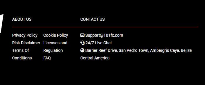 Под свои довольно сомнительные контакты аферисты 101 ФХ не отводили отдельный раздел своего сайта, вместо этого шулера 101FX разместили свои контакты в конце подвального сайта. Данных контактов у аферистов 101 ФХ довольно мало, что говорит об их не особом желании иметь дело с наивной клиентурой. Итак контакты проходимцев 101FX: