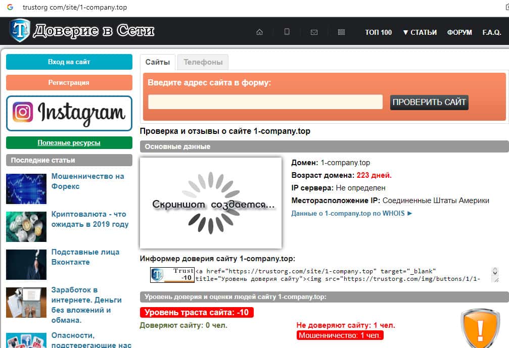 Согласно данным с уважаемого интернет-портала trustorg com, возраст домена ресурса сомнительной конторы составляет 223 дня с месторасположением в США. Что касается Уровень доверия и оценки людей интернет-странице 1-company top - он составляет -10. А также есть один человек, который уличил веб-портал в мошенничестве. В общем, лохотрон.