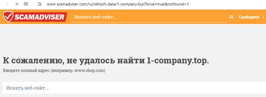 На нижерасположенном изображении можно воочию увидеть результаты проверки известного веб-сайта scamadviser com, который проверяет является ли тот или иной веб-портал мошенническим. Но данная площадка не смогла идентифировать и разыскать сведения о ресурсе жульнической организации 1-Компани Топ.