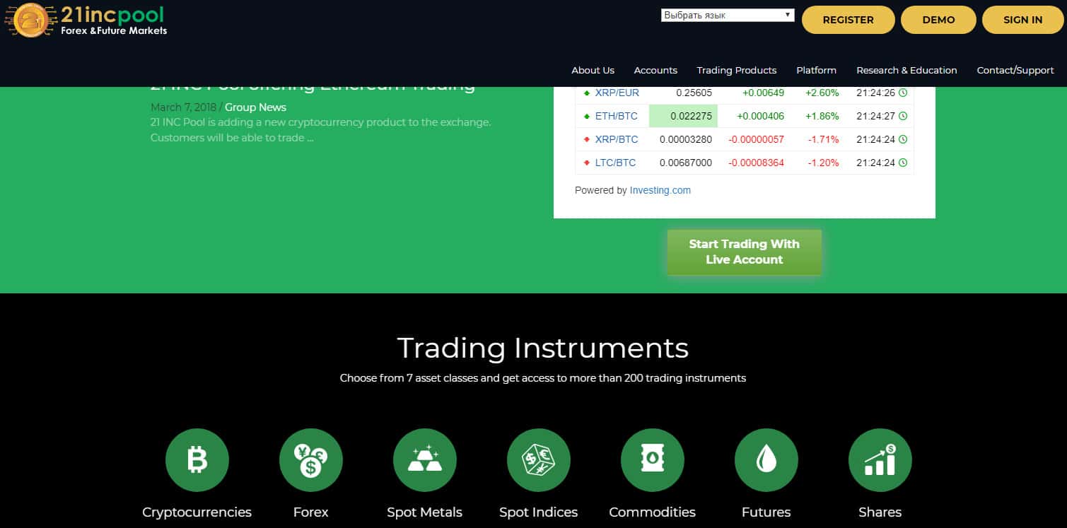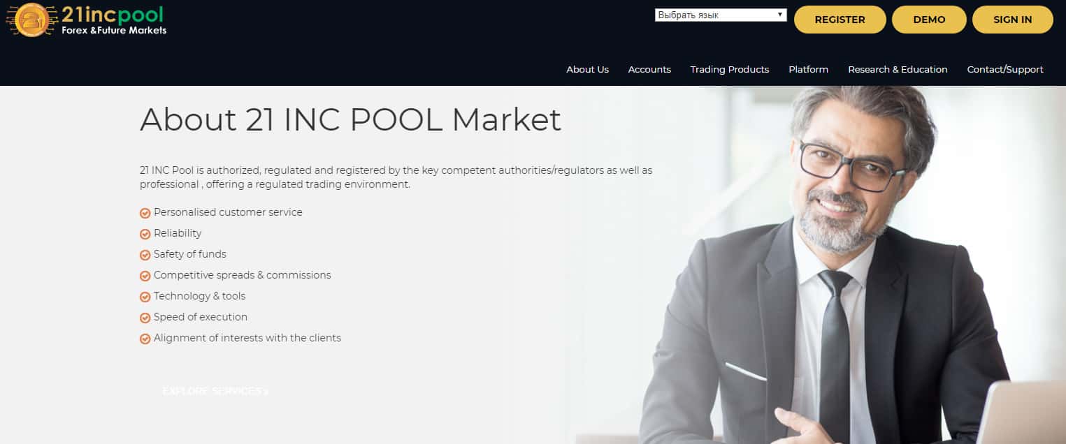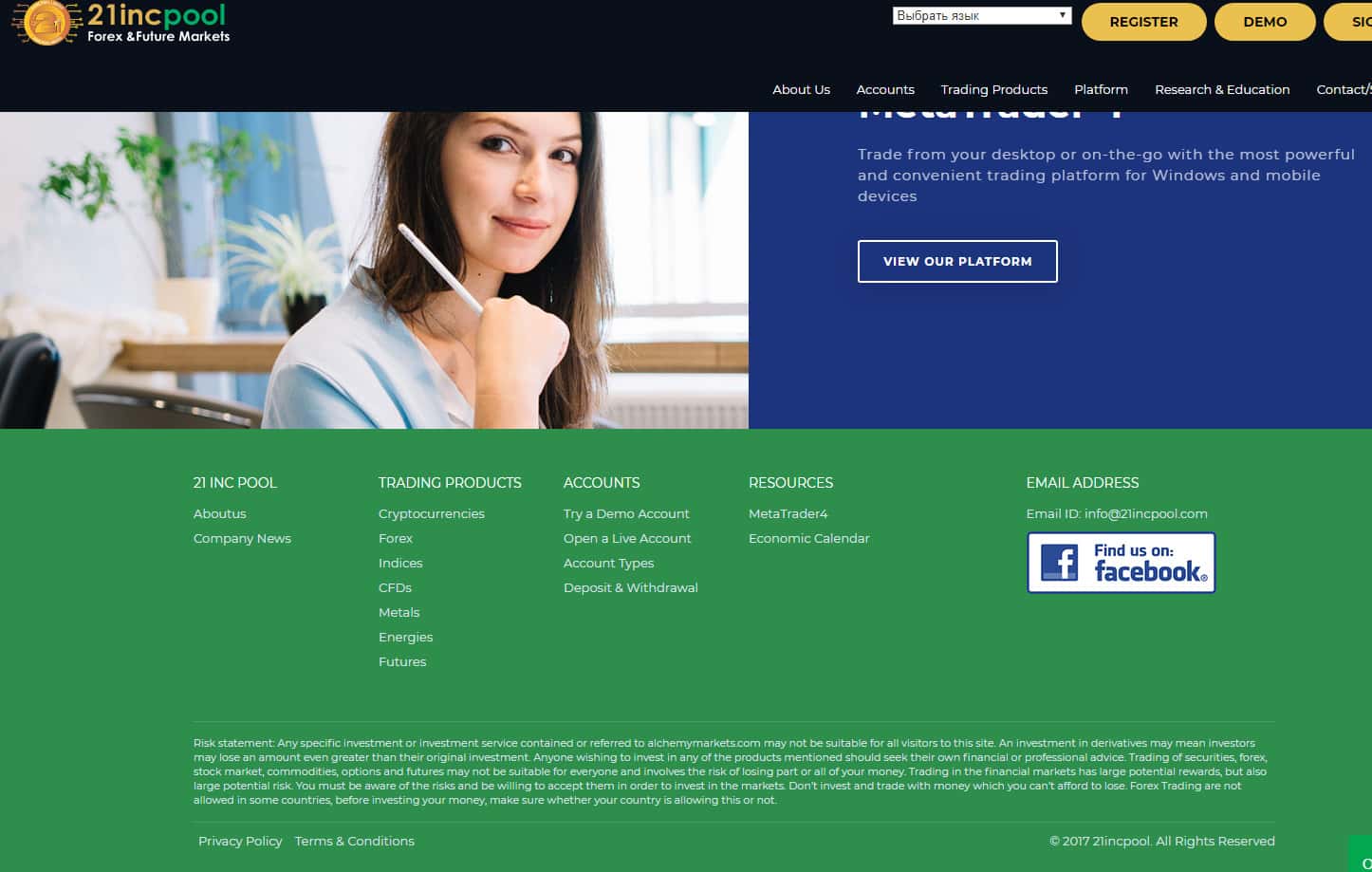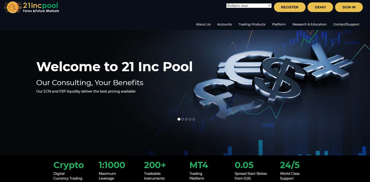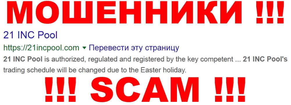 21 ИНК Пул - очередные мошенники сети интернет, которые занимаются наглым разводом наивных пользователей сети под довольно банальным предлогом торговли форекс, в ходе которой аферисты 21 INC Pool оперативно кидают наивных пользователей на деньги. В связи с этим иметь дело и сотрудничать с лохотроном 21 ИНК Пул определенно не рекомендуем !!!