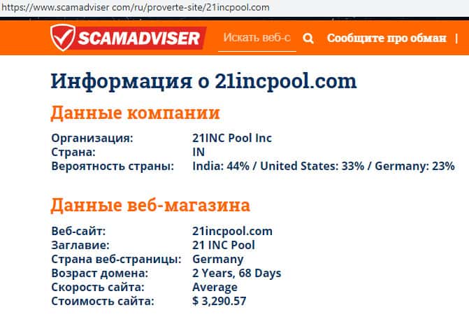 В связи с мошеннической и противозаконной деятельностью лохотрона 21 ИНК Пул его реальные руководители предпочитают анонимность дабы избежать ответственности со стороны правоохранительных органов. Техническую информацию о самом же сайте шулеров 21 INC Pool можно узнать с помощью портала scamadviser com, который вы можете увидеть ниже.