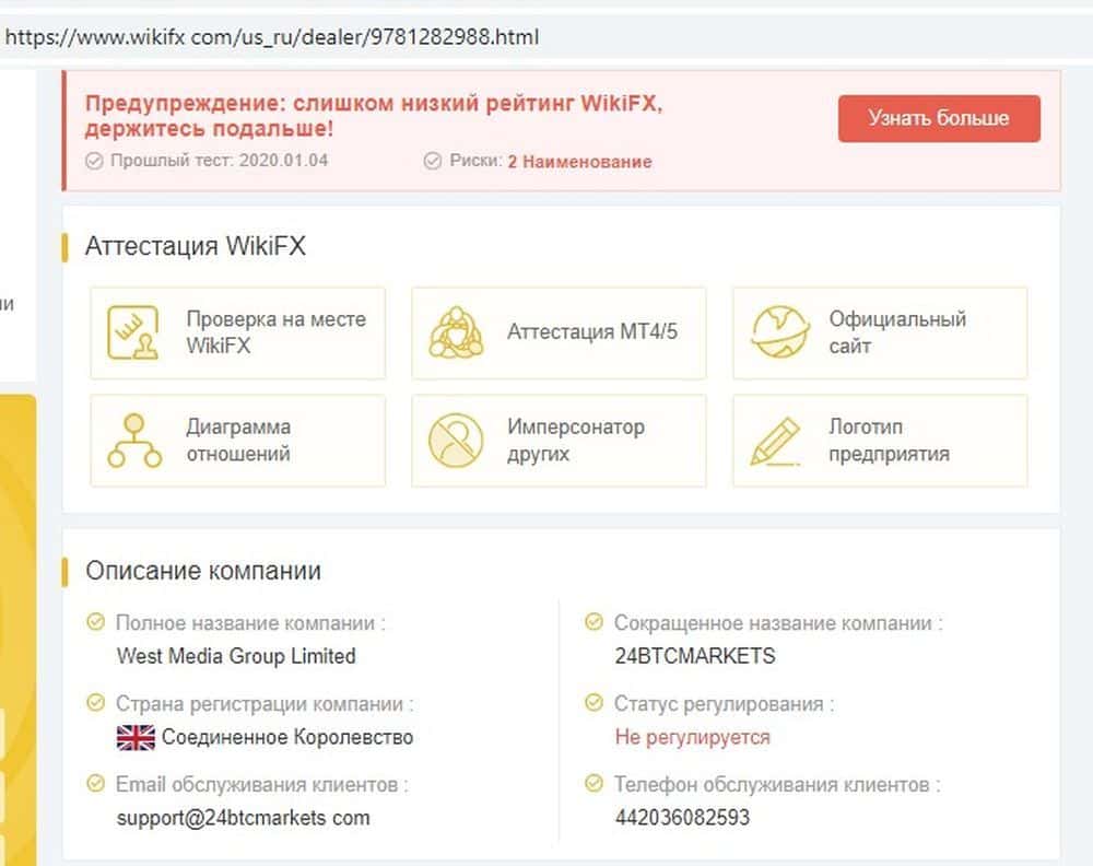 Мошенники 24BTCMarkets - один из многочисленных проектов лохотрона West Media Group Limited. Создают сайты-однодневки, придумывают легенду, название, собирают с доверчивых новичков деньги и исчезают с ними. Такая схема возможна благодаря оффшорной регистрации центральной конторы. Адрес неизвестен, находится она в Швейцарии.