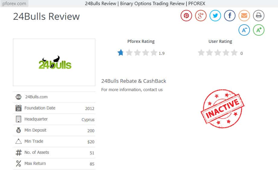На немногих честных веб-порталах всё еще имеется некоторая информация о шарашкиной конторе 24 буллс. На приведённом выше онлайн-ресурсе мы видим некоторую общую информацию о шулерах. Ниже мы привели также веб-сайт, на котором опубликованы некоторые данные о торговых условиях шарашки 24 bulls, которые оказались простым завлекаловом.