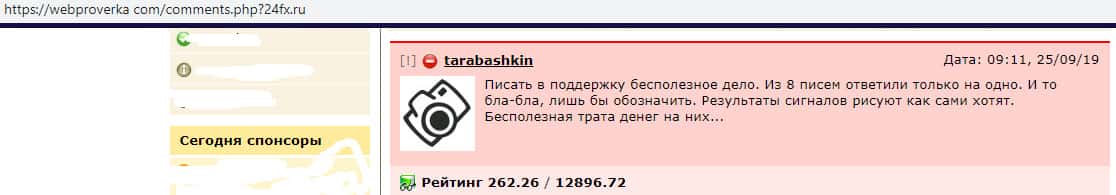 На ниже расположенном изображении вы можете наглядно увидеть реальный негативный отзыв в сторону мошенников 24FX Ru с веб-сайта вебпроверка ком от очередного наивного пользователя сети интернет, который повелся на лапшу на уши в исполнении жуликов 24 ФХ сигналы и по итогу был кинут жуликами, которые игнорируют пользователя.