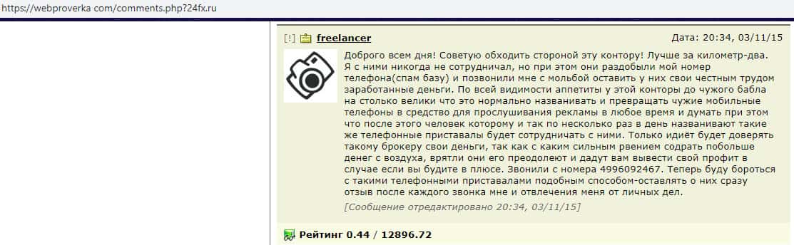 На изображении, расположенном ниже, вы можете увидеть еще один реальный негативный отзыв об аферистах 24FX Ru, который связан непосредственно с тем, что аферисты 24 ФХ Сигналы в телефонном режиме терроризировали наивного пользователя сети интернет в попытках привлечь его в свою помойку для дальнейшего развода на деньги.