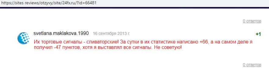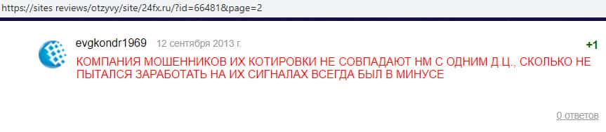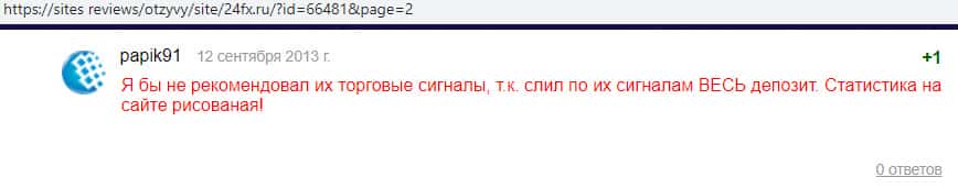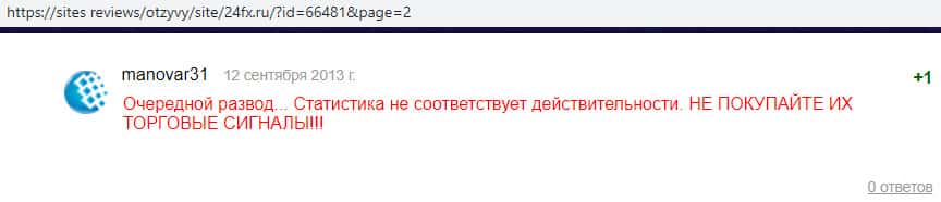 На ниже расположенном изображении вы можете наглядно увидеть еще один реальный негативный комментарий в сторону аферистов 24 ФХ сигналы от еще одного наивного пользователя сети интернет, которые не рекомендует иметь дело с мошенниками 24FX Ru ввиду того что проходимцы 24 ФХ сигналы попросту берут с воздуха.