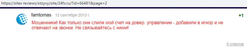 На ниже расположенном изображении вы можете наглядно увидеть еще один реальный негативный отзыв в сторону аферистов 24 ФХ сигналы, который связан с тем, что клиент повелся на уговоры мошенников 24FX Ru и передал им свои средства в доверительное управление, однако по итогу был ожидаемо кинут проходимцами 24 ФХ сигналы.