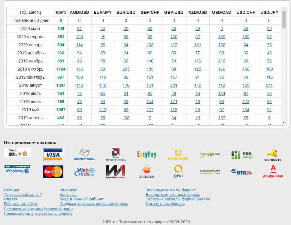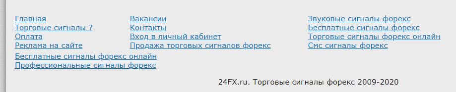 Завершается же сайт у аферистов 24FX Ru довольно сомнительным блоком итогов, а так же ссылками на различные разделы подвального сайта мошенников 24 ФХ сигналы, которые размещены довольно криво, что снова говорит об определенной халтуре со стороны шулеров 24FX Ru. На изображении ниже вы можете увидеть окончание сайта аферистов.