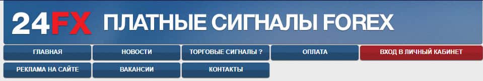 Начинается подвальный сайт у лохотрона 24 ФХ сигналы с довольно корявой шапки сайта, в которой у проходимцев 24FX Ru расположены ссылки на различные разделы подвального сайта аферистов, а так же логотип конторы мошенников 24 ФХ сигналы. На изображении, расположенном ниже, вы можете наглядно увидеть шапку подвального сайта.