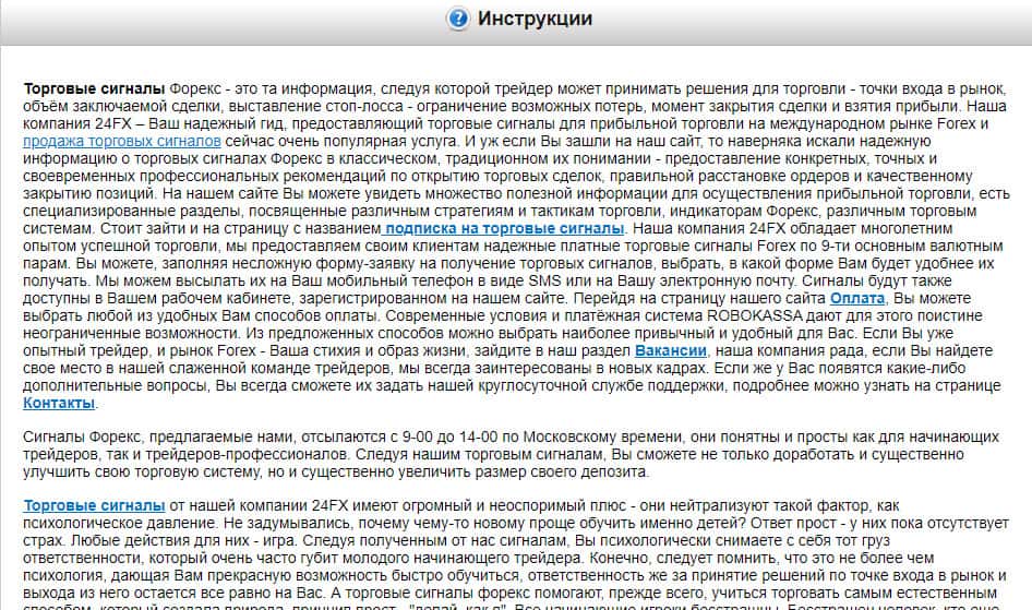 После на подвальном сайте у аферистов 24 ФХ сигналы следует довольно сомнительный раздел с инструкциями по использованию данного подвального сайта, который не особо привлекает, что говорит о халтуре жулья 24FX Ru при создании сайта. На изображении, расположенном ниже, вы можете увидеть очередной раздел сайта проходимцев.