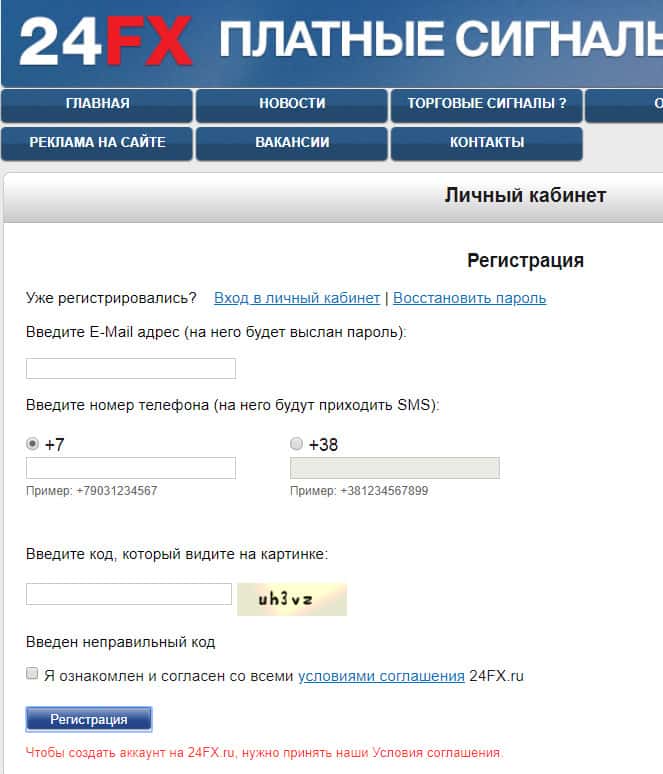 Стоит так же отметить, что аферисты 24FX Ru не особо то и старались при создании своего подвального сайта, в чем можно убедиться перейдя на страницу регистрации. А проблема заключается в том, что у аферистов 24 ФХ сигналы попросту нету банальной валидации, в связи с чем только поставив флажок на согласие можно отправить пустую форму в базу жулья.