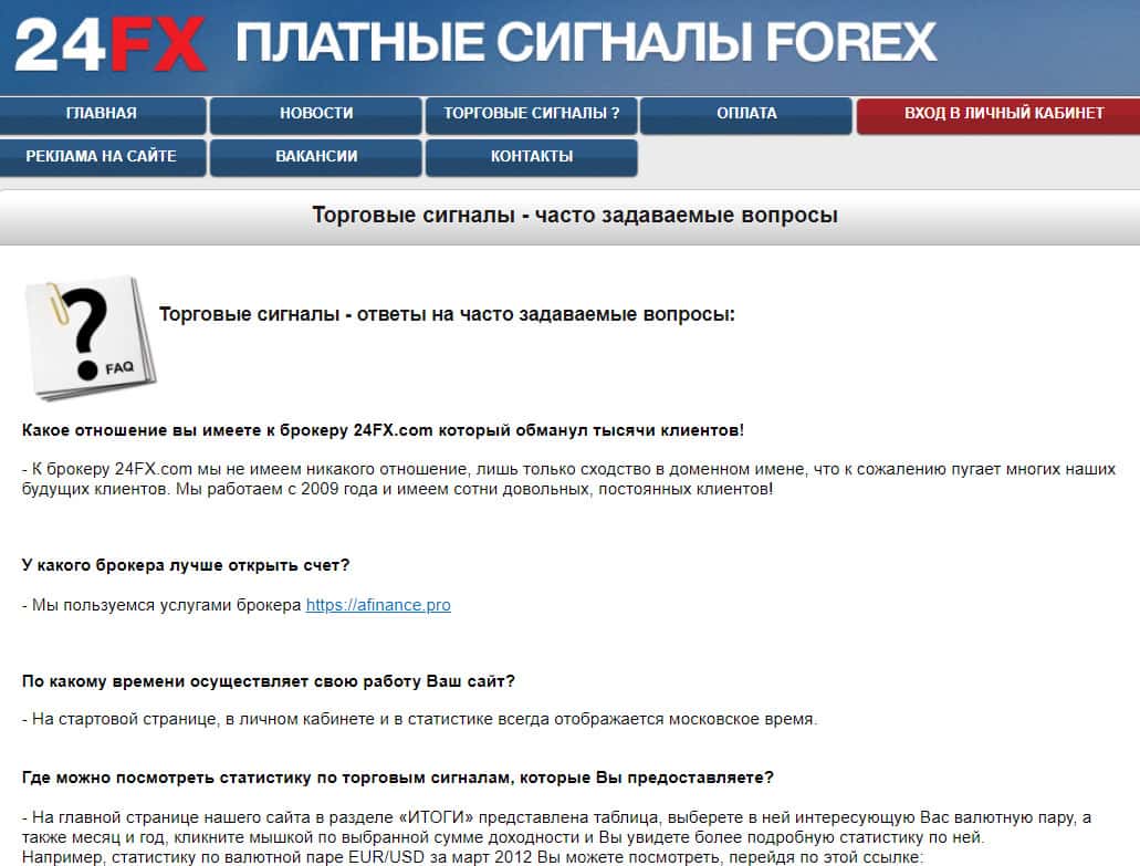 Непонятно зачем, но аферисты 24FX Ru решили воспользоваться довольно старой, но проверенной схемой по привлечению внимания наивных пользователей с помощью раздела, в котором мошенники 24 ФХ сигналы якобы отвечают на самые популярные вопросы. Однако на деле же данный раздел не несет в себе никакой информационной или смысловой нагрузки.