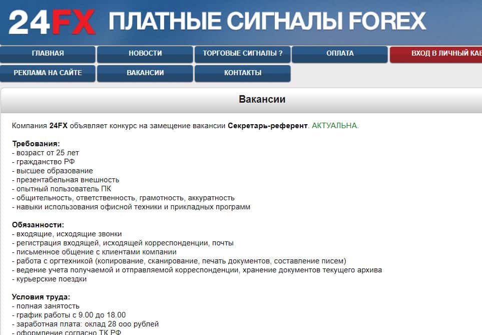 Дабы вызвать ощущение доверия и надежности мошенники 24 ФХ сигналы разместили на своем подвальном сайте довольно сомнительный перечень своих якобы вакансий, на который они набирают людей. Однако это очередная лапша на ушив исполнении аферистов 24FX Ru, которые таким образом свой сайт, что вы можете увидеть ниже.