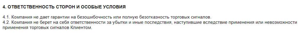 Далее в условиях сотрудничества аферистов 24 ФХ сигналы следует довольно ожидаемый раздел с отказом от ответственности за предоставляемые мошенниками 24FX Ru услуги, которые собственно и покупают наивные пользователи сети интернет на данном сайте. На изображении, расположенном ниже, вы можете наглядно увидеть следующий раздел условий.