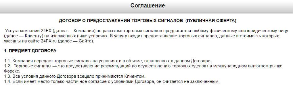 Условия клиентского соглашения мошенников 24 ФХ сигналы