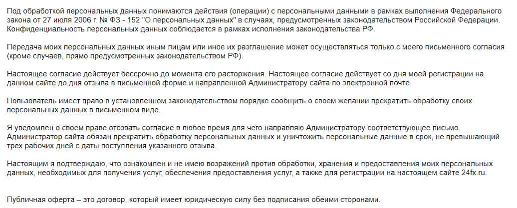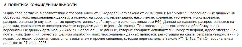 Завершается же политика конфиденциальности лохотрона 24 ФХ сигналы реальной "водой", которая не несет никакой смысловой нагрузки и попросту еще раз говорит о том, что пользователи соглашаются со всеми условиями проходимцев 24FX Ru. На изображении, расположенном ниже, вы можете наглядно увидеть окончание политики.