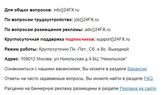 - почты [email protected] и job@24FX ru и adv@24FX ru и support@24FX ru