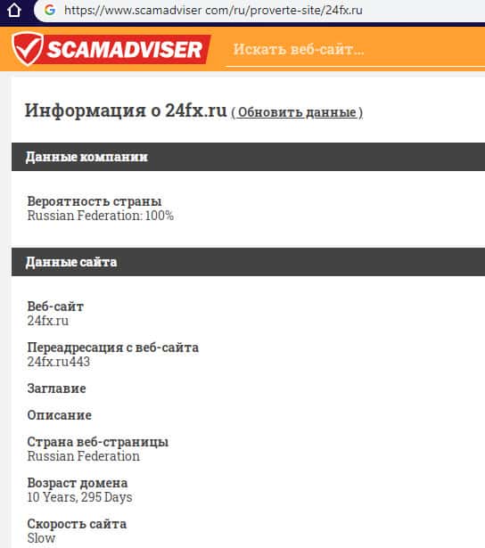 scamadviser com - сайт с технической информацией о лохотроне 24FX Ru