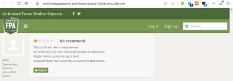 На портале forexpeacearmy com пользователь под псевдонимом cabrellesj оставил свой отклик, в котором называет контору 24 FXM "scam and lie broker". Он говорит, что это самый худший брокер, который только может быть в наше время. Люди не ведитесь на подобный лохотрон. Берегите деньги и нервы! По словам этого "честного" брокера понятно сразу, что текст был написан не простым клиентом.