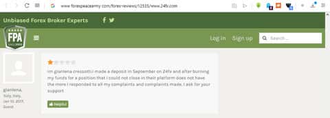 "im gianlena cressotti.I made a deposit in September on 24fx and after burning my funds for a position that I could not close in their platform does not have the more I responded to all my complaints and complaints made, I ask for your support" - слова пользователся gianlena о работе этой шайки воров, что в сотый раз доказывает всю гнилость мошеннического сервиса 24ФХМ.