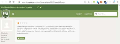 " They changed position 1 micro Lot to 1 Standard LOT on their own and also squared off position which actually did not trade at the values on the chart. I lost a lot of money and there is no response from their side till now with more than 7 months." - слова пользователя Mudasir, которые в сотый раз убеждают нас, что 24 ФХМ - лохотрон, созданный мошенниками для обеспечения своего существования.