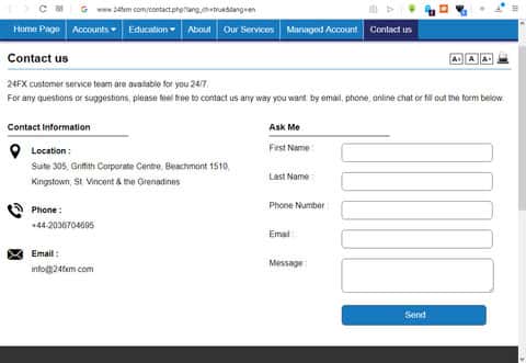Пройдя по недрам сайта 24 ФХМ, можно найти информацию о них, точнее контактную информацию. Впрочем, ничего нового мы там не находим, кроме номер телефона, с которым оператор не соединяет. Адрес, конечно, мы давно знаем, типичное месторасположение для мошеннического лохотрона - офшорная зона на островах Сент-Винсенты и Гренадины. Суть такова, что 24 ФХМ - жулики, живущие за чужие деньги.