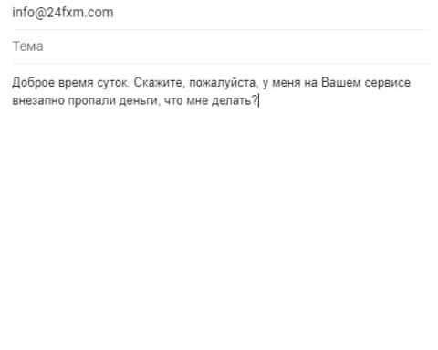Так как есть люди, которые верят каким-то жуликам до последнего, то нам надо полностью убедить их в обратном. Поэтому мы проведём мини-эксперимент, в котором попытаемся поразговаривать, хоть и в письменной форме, с мошеннической оффшорной конторой 24 ФХМ. Попробуем напистаь им в техническую поддержку сообщение с недовольствами и с непредвиденной ситуацией в сфере финансов. И от этого ответа зависит всё. Уже прошло пару дней, а ответа нет, хотя на сайте 24/7 поддержка.