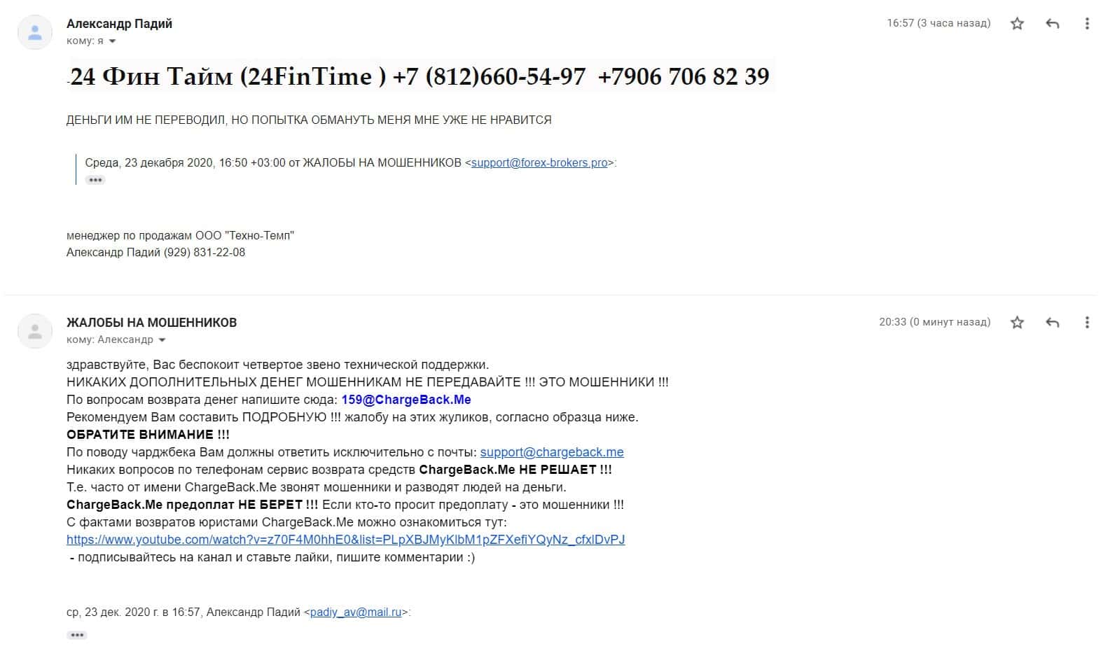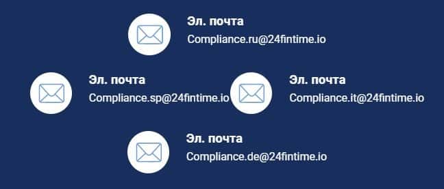 Также аферисты 24 Фин Тайм указали электронные адреса по которым с ними якобы можно будет связаться. Но насколько они достоверны некто не знает. так как с них никто не отвечает.