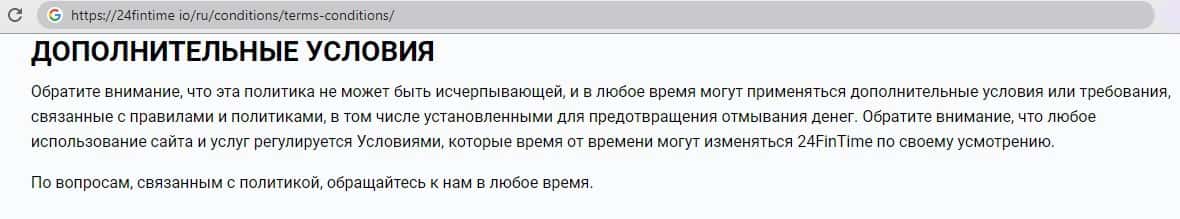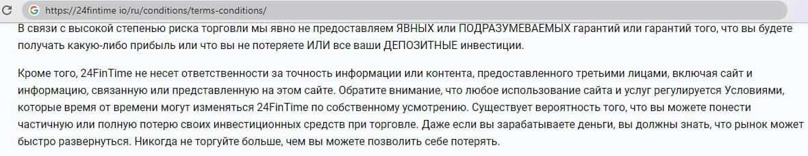Подвальная организация 24FinTime io отказывается от ответственности за любые свои действия. То есть вправе делать всё, что она захочет и когда захочет.