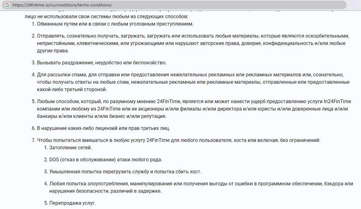 - Информация о пользовательском соглашении мошенников 24FineTime io