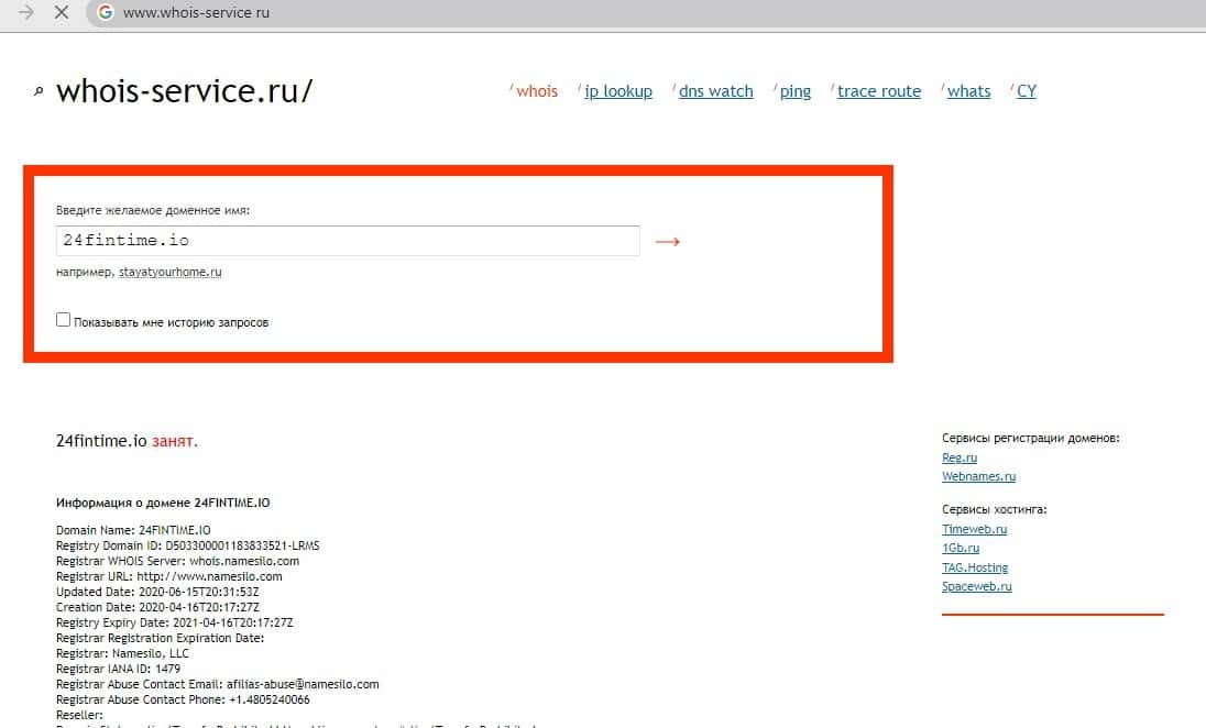 - Данные про владельца домена мошенников 24 Фине Тайм