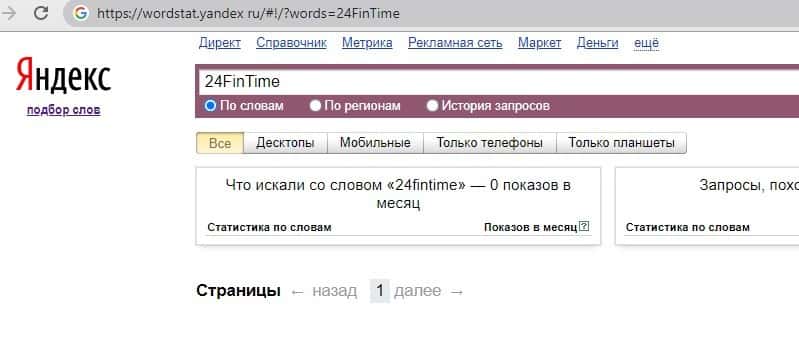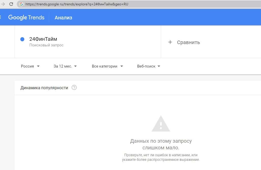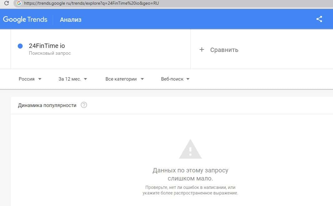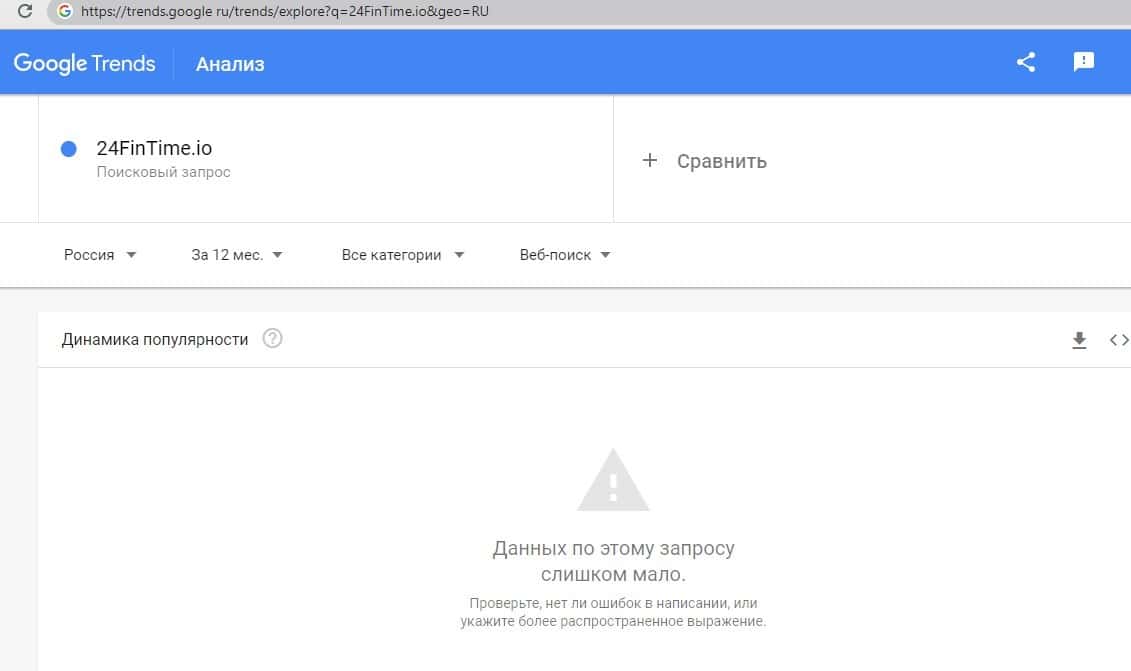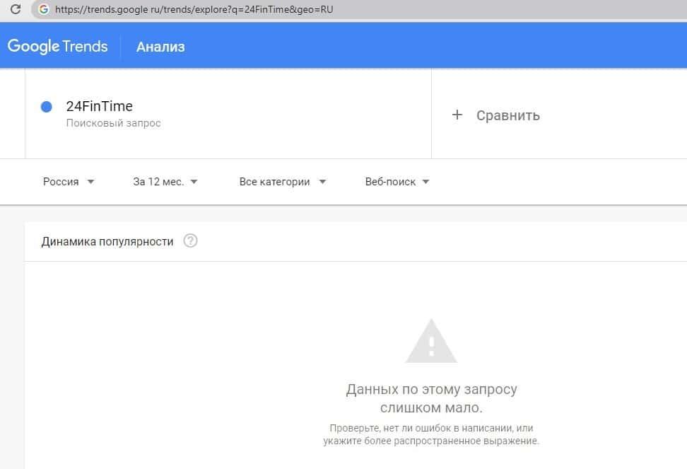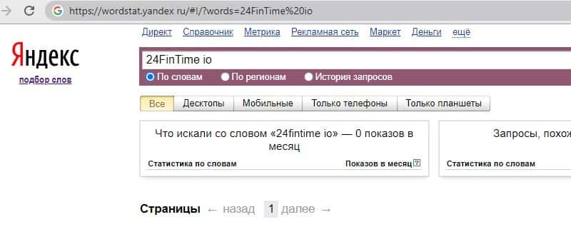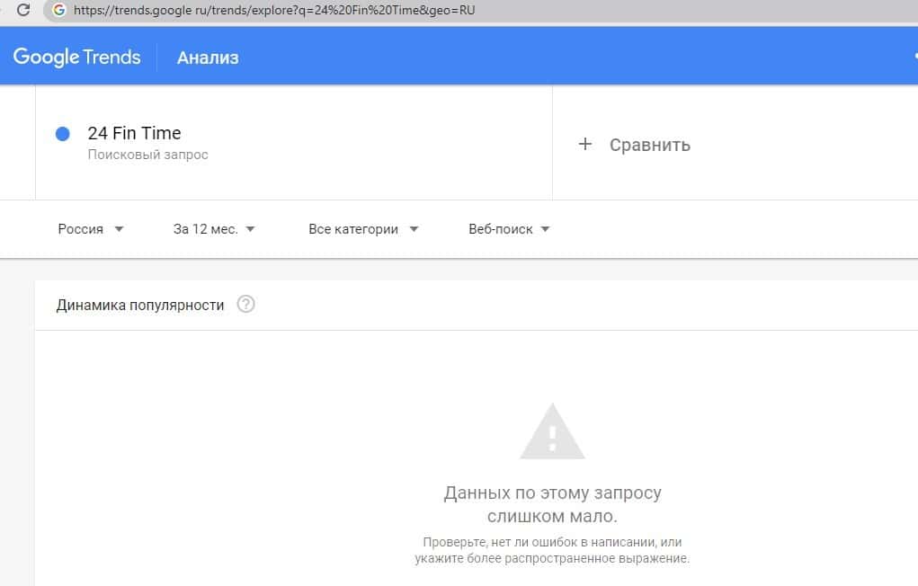 При проведении поискового запроса по бренду "24 Fin Time", система поиска выдаёт ноль показов за месяц так как данные аферисты не пользуются доверием среди клиентов.