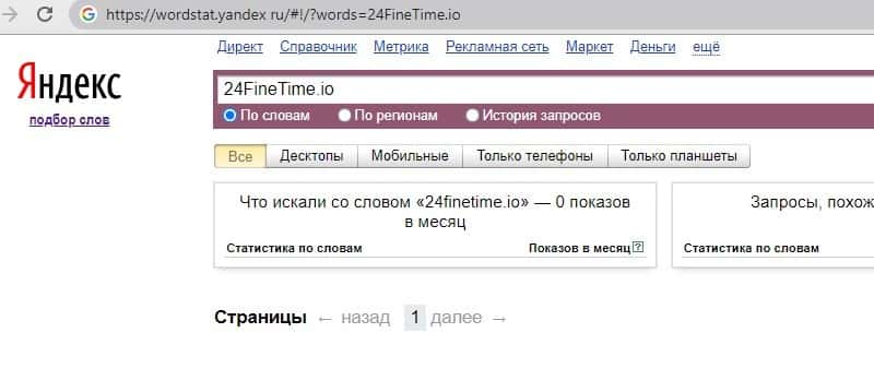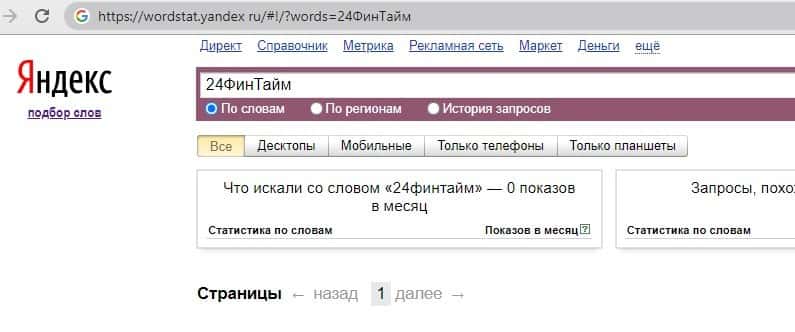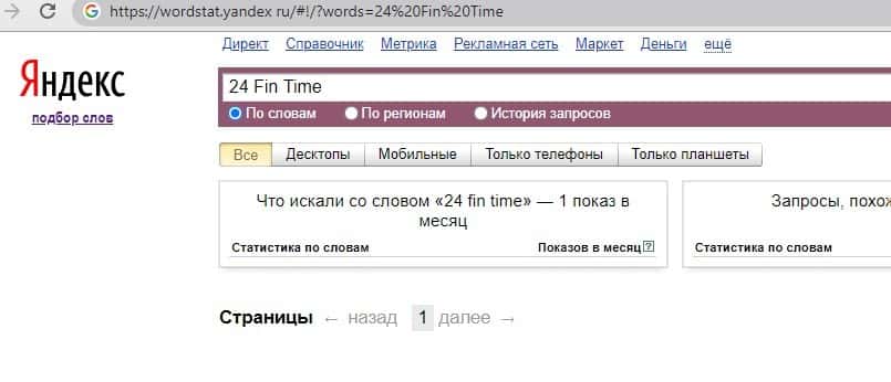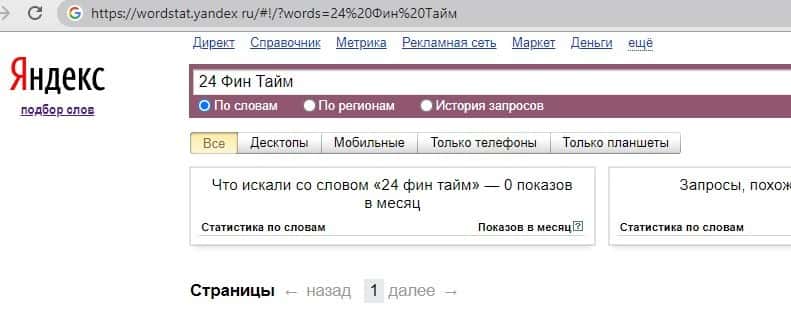 - Данные по запросу бренда 24Фине Тайм в поисковике Яндекс