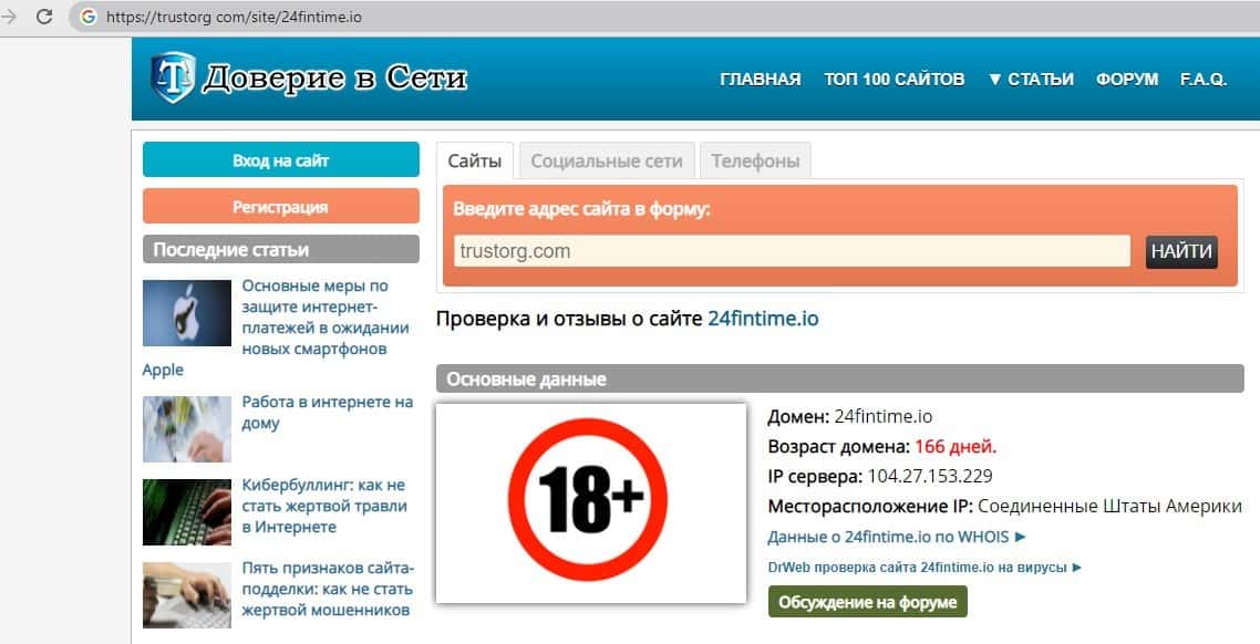 Данные о лохотроне 24 Фине Тайм с портала скамадвайзер