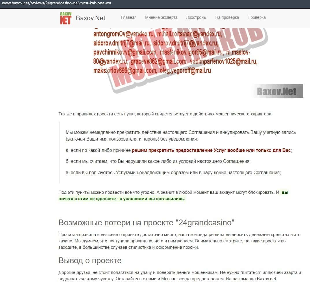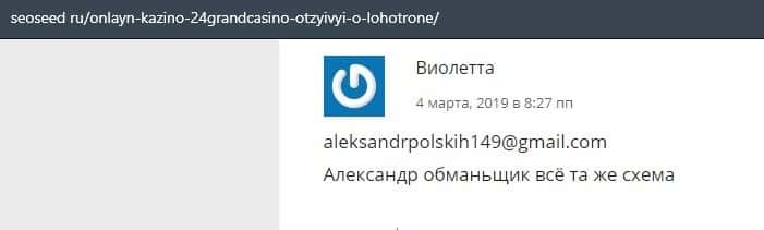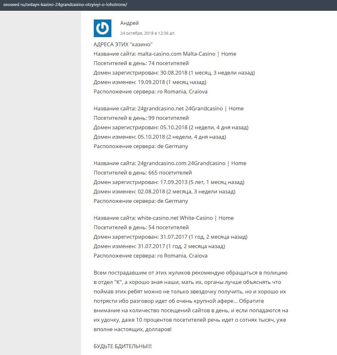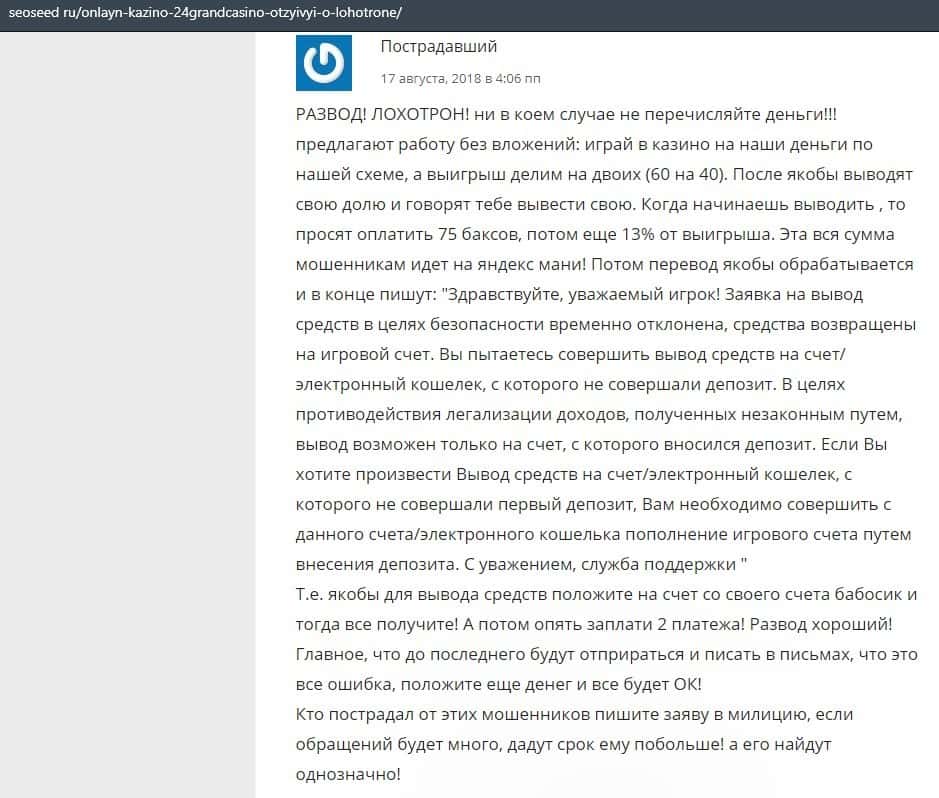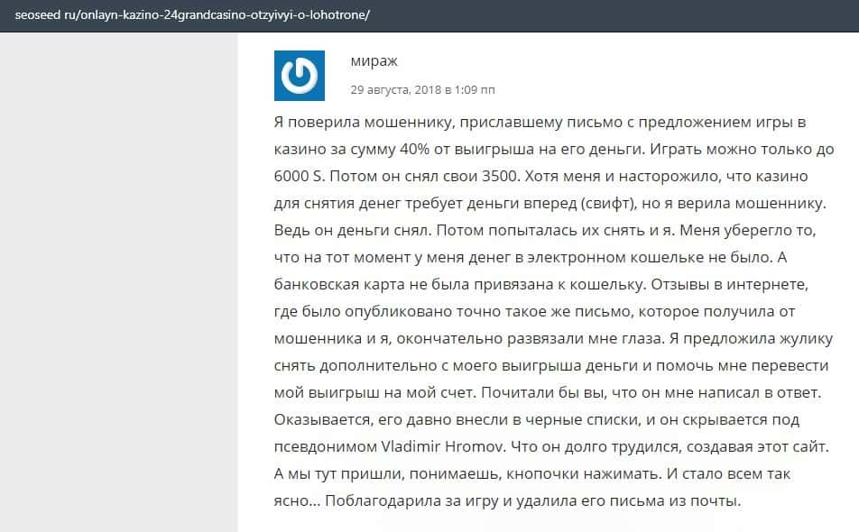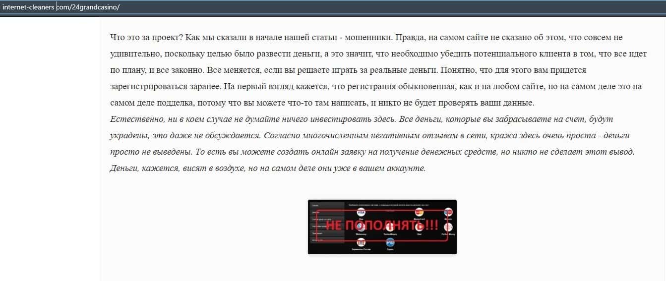 Далее представлена информация о конторе 24GrandCasino Net, где определенно указано, что мошенники используют схемы развода, чтобы выманить из клиента все его деньги.