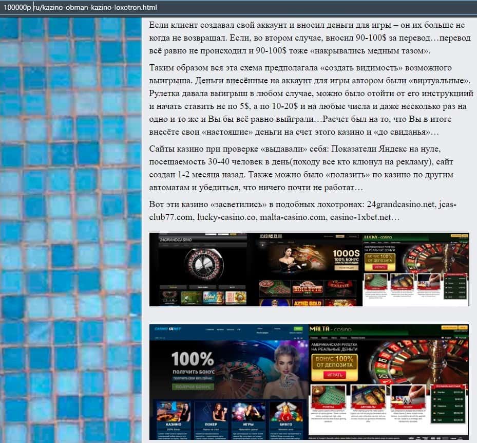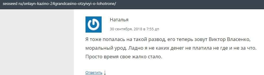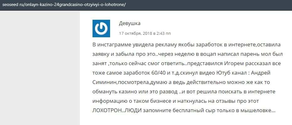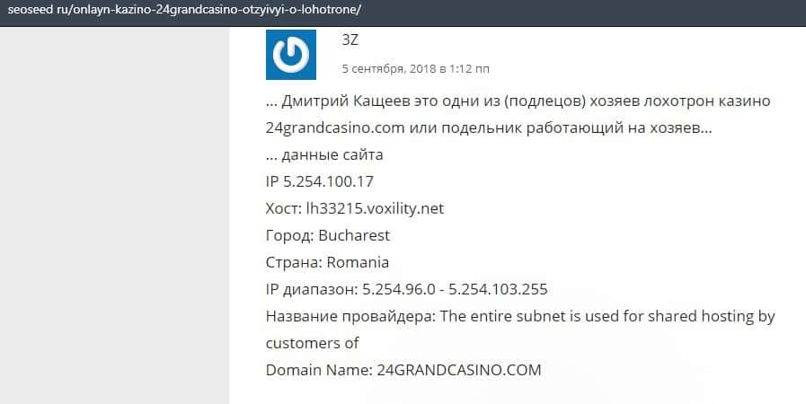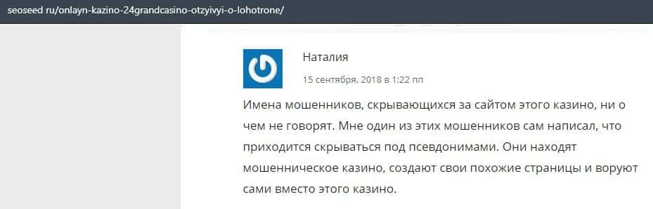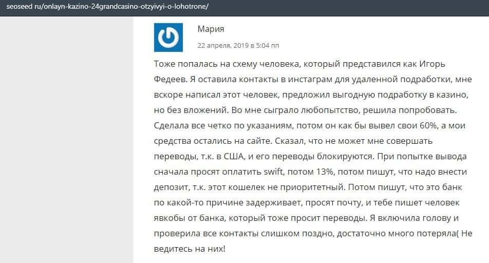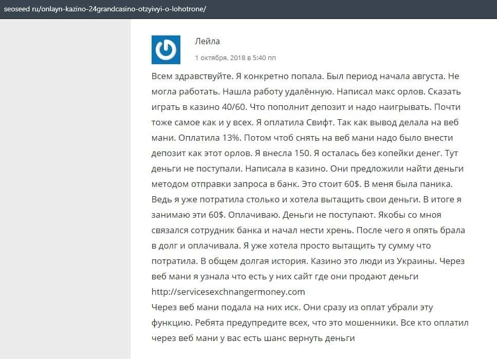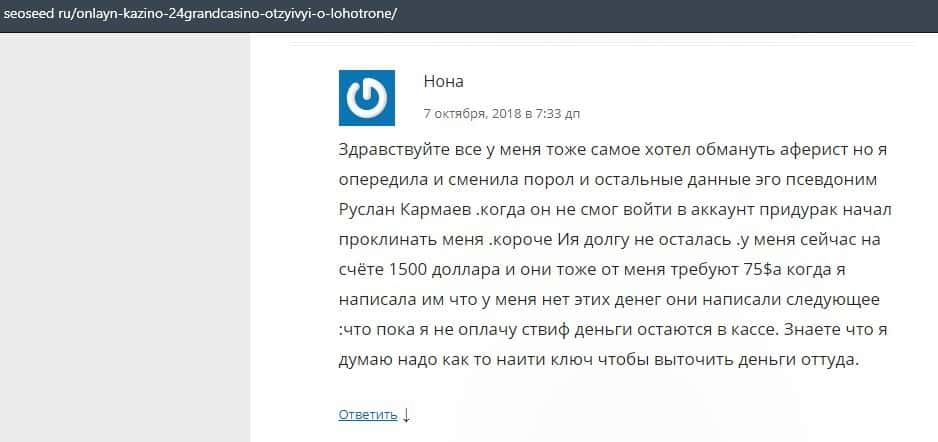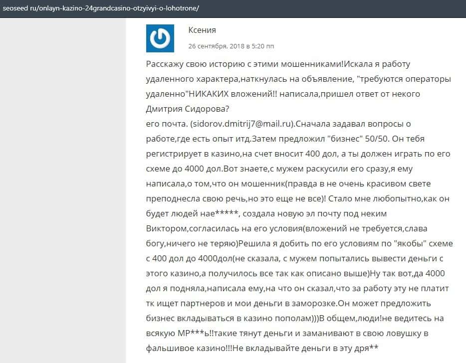 Далее представлена информация о конторе 24GrandCasino Net, где определенно указано, что мошенники используют схемы развода, чтобы выманить из клиента все его деньги.