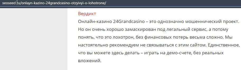 Далее представлен вывод к одной из статей о конторе 24 Гранд Казино, где описывается, что это однозначно мошеннический проект, который маскируется под легальный сервис.