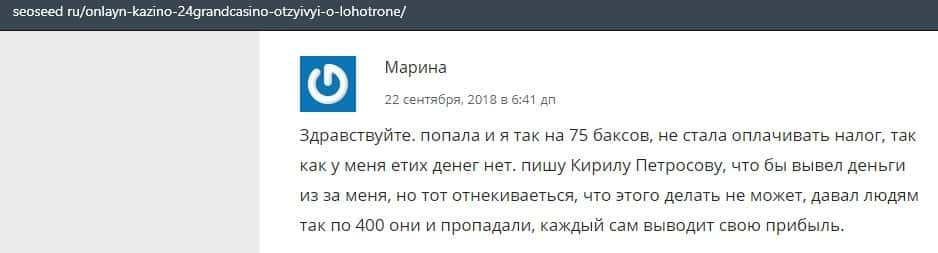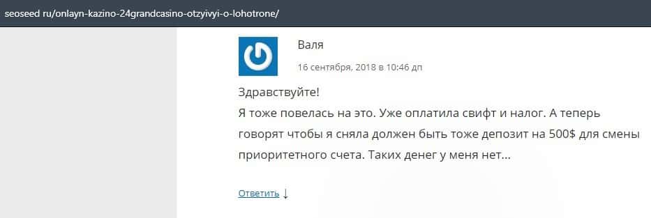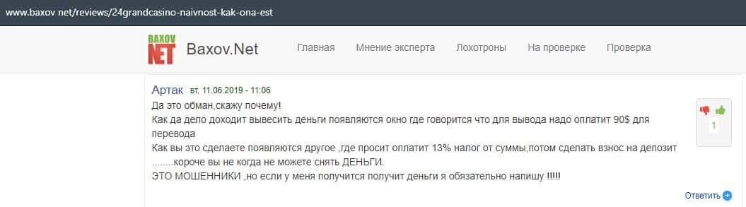 Еще одно подтверждение в виде данного отзыва о конторе 24GrandCasino Net, где аферисты просят заплатить определенную сумму денег в виде налога и комиссии.
